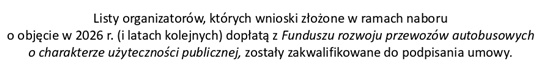 W 2026 roku dofinansowaniem objętych zostanie 79 wniosków organizatorów. W ramach zawartych na 2026 rok umów przewozy mają być realizowane w sumie na 824 liniach autobusowych, na trasach o długości 28.805,08 km.