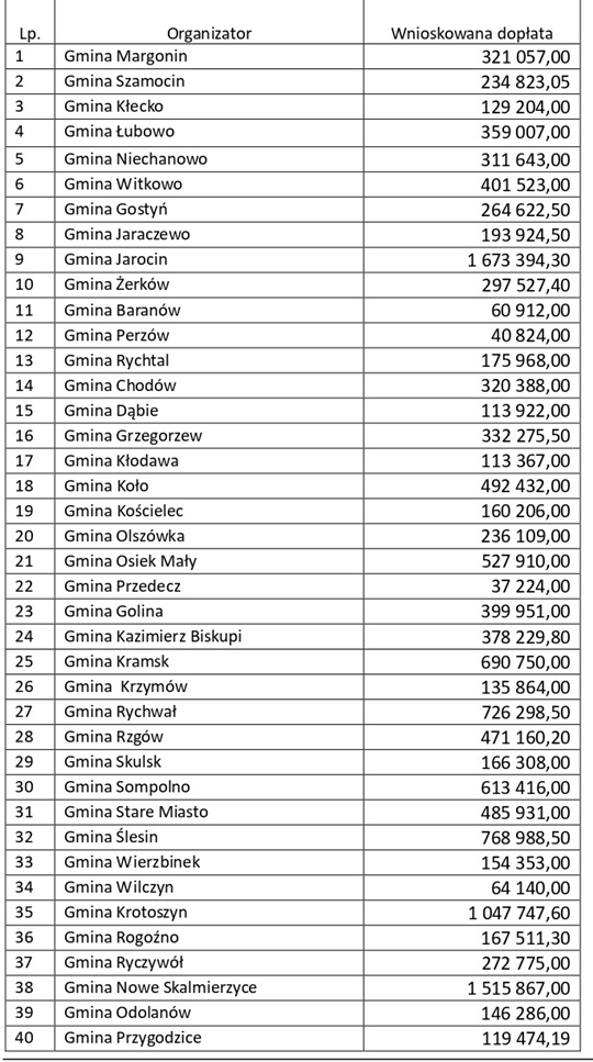Ogłoszony przez wojewodę 21 listopada 2025 roku nabór wniosków na dofinansowanie realizacji zadań własnych organizatorów przez dopłatę do ceny usługi w zakresie przewozów autobusowych o charakterze użyteczności publicznej cieszył się bardzo dużym zainteresowaniem. W odpowiedzi na ogłoszenie wpłynęło 88 wniosków organizatorów. Dla województwa wielkopolskiego przeznaczono na 2026 rok blisko 22 mln zł na zadania wieloletnie objęte umowami z 2025 roku oraz kwotę ponad 43 mln zł do rozdysponowania na rok 2026.